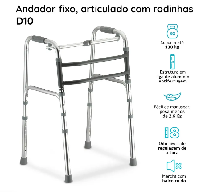 O Andador D10 Dellamed foi especialmente projetado para oferecer suporte a adultos e idosos com dificuldades de locomoção. Este modelo versátil permite ao usuário escolher entre uma marcha fixa, móvel ou articulada, proporcionando maior liberdade de movimento.