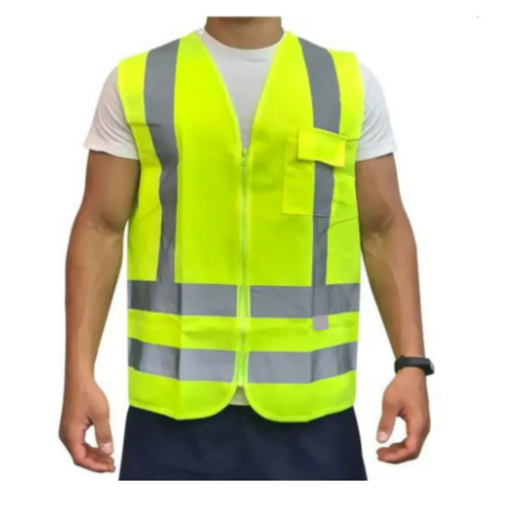 Vestimenta de proteção e segurança de alta visibilidade, tipo colete, confeccionado 100% com tecido sintético de poliéster, sem manga e fechamento em zíper. Contém 1 bolso frontal com fechamento em velcro. Possui faixas refletivas sendo duas verticais na área do tórax, vista frontal e duas horizontais na área do abdômen e costas. Ainda possui uma faixa refletiva em formato de x nas costas.