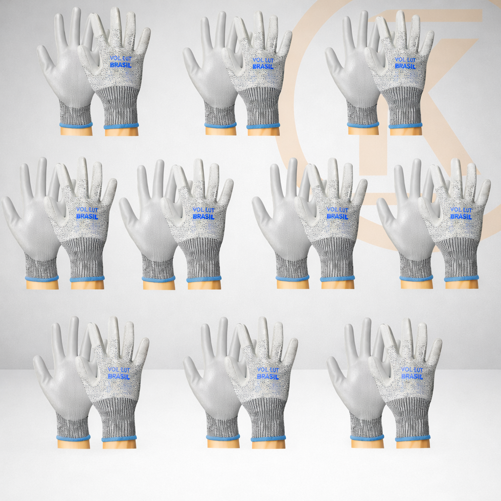 Luva de segurança Cut na cor cinza, agora em kit com 10 pares, ideal para quem precisa de proteção constante no dia a dia com excelente custo-benefício.
