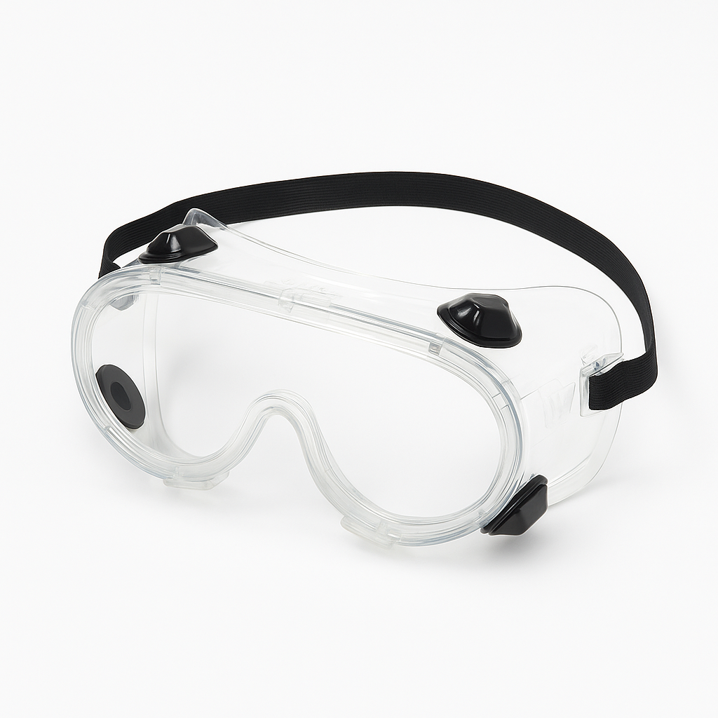 Óculos de segurança ampla visão, com lente de proteção em policarbonato, com tratamento antirrisco, antiembaçante e UV, ventilação indireta, armação em PVC flexível e elástico ajustável.