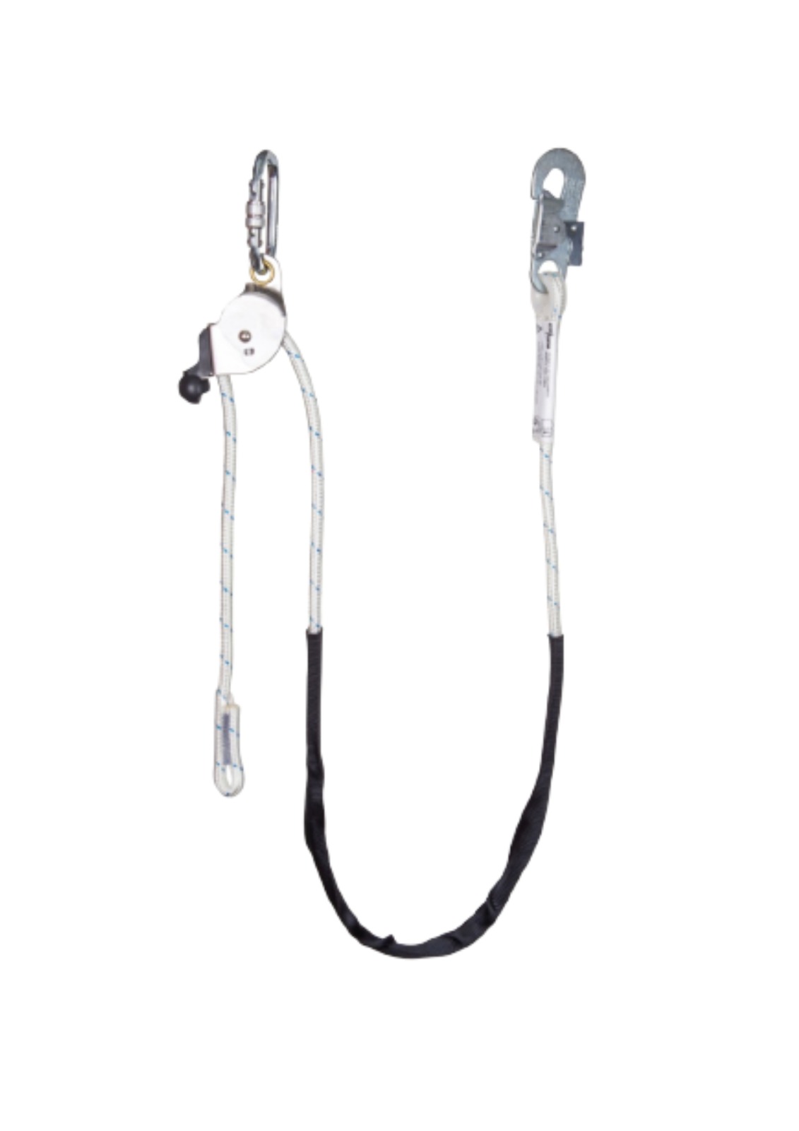 MODELO: SAFE CORDA DESCRIÇÃO: Confeccionado em corda poliamida de 12mm com revestimento em fita tubular de alta resistência. Dispõe de 1 mosquetão classe "T" confeccionado em aço com abertura de 17+/ 3mm, um conector classe B em aço do tipo oval com trava rosca, abertura de 18mm e um regulador em aço inox; comprimento máximo de 2,00m.